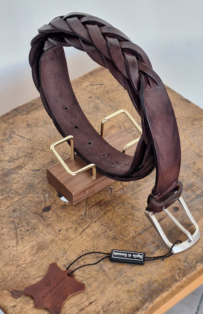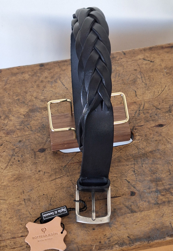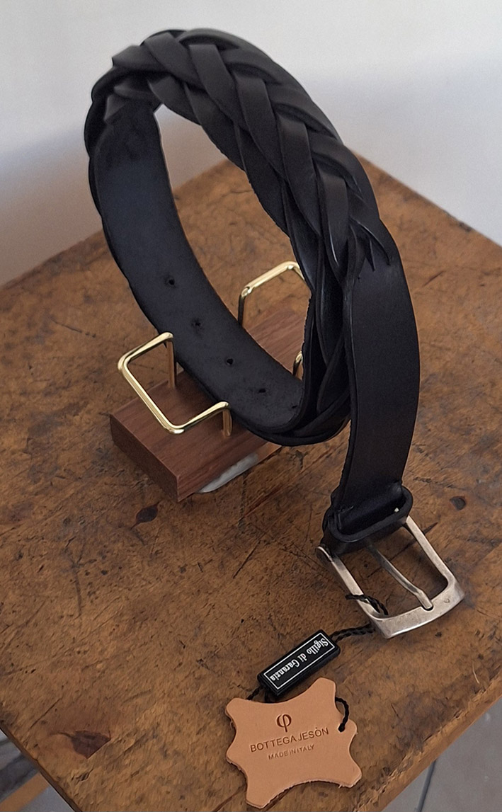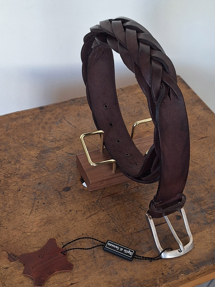 Cintura conciata al vegetale intrecciata a mano con fibbia in argento invecchiato .